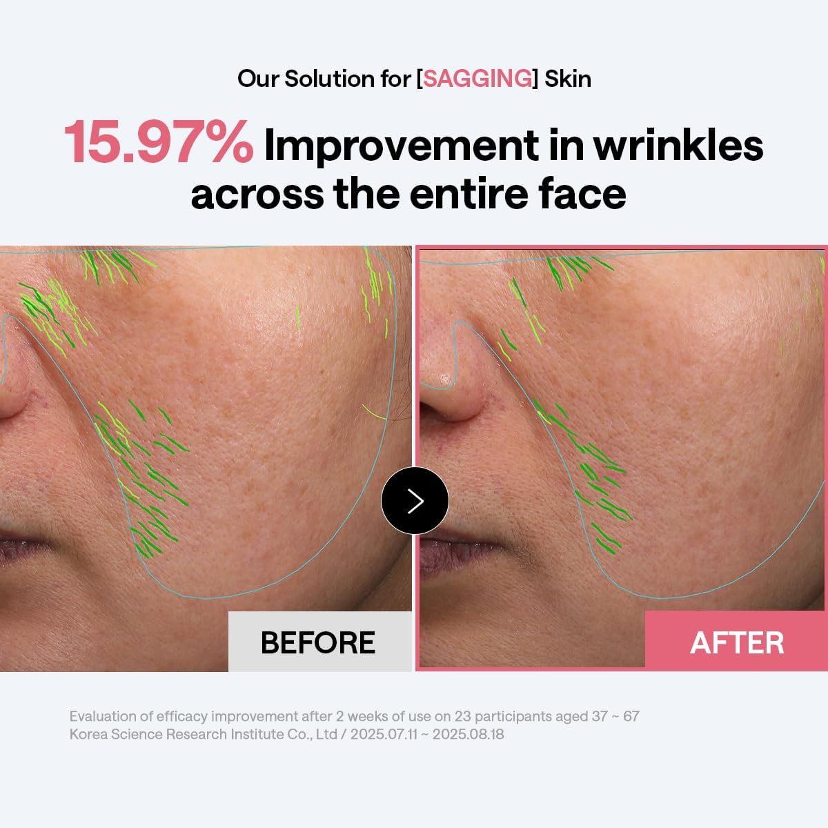 - Reduces the appearance of fine lines in the eye area and smile lines by 30% and forehead lines by 33%