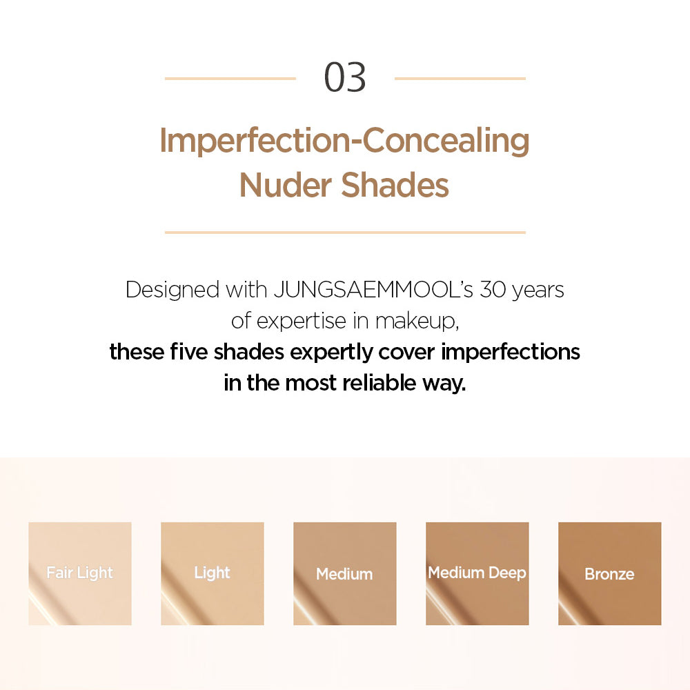 Jung Saem Mool's Skin Nuder Cushion Concealer is designed for a radiant, flawless finish. Infused with 62% essence, this cushion offers thin, lightweight coverage that adheres beautifully to the skin, delivering a naturally luminous look. The light-correcting pearl powder enhances your complexion, leaving you with a glowing finish that lasts up to 12 hours. With SPF 50+ PA+++, your skin is protected from harmful UV rays, making this cushion an essential in your daily routine. The product has completed a skin irritancy test with no irritation, ensuring it’s suitable for all skin types, even the most sensitive.