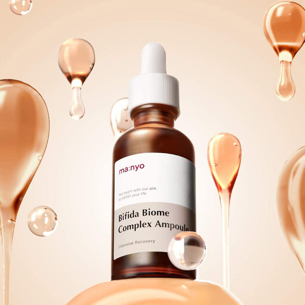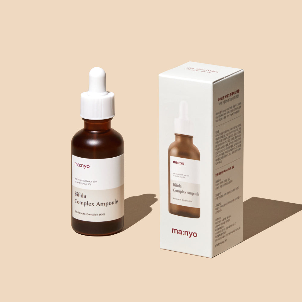 Ma:nyo Factory's Bifida Biome Complex Ampoule replenishes and balances the skin, promoting a more youthful-looking complexion. This highly concentrated formula revives sensitive skin, leaving it radiant and refreshed. Powered by patented Bifida Biome™ and five types of probiotics, this ampoule helps fortify the skin’s microbiome, strengthening the skin barrier to defend against external stressors while locking in moisture. It works to refine tone and texture while brightening the complexion. Ten types of hyaluronic acid penetrate different layers of the skin, delivering deep hydration that visibly plumps and smooths. With a pH of 7.40±1.00, this ampoule is vegan and cruelty-free, formulated without artificial fragrances, colors, parabens, sulfates, animal products, alcohol, mineral oils, essential oils, or silicone.