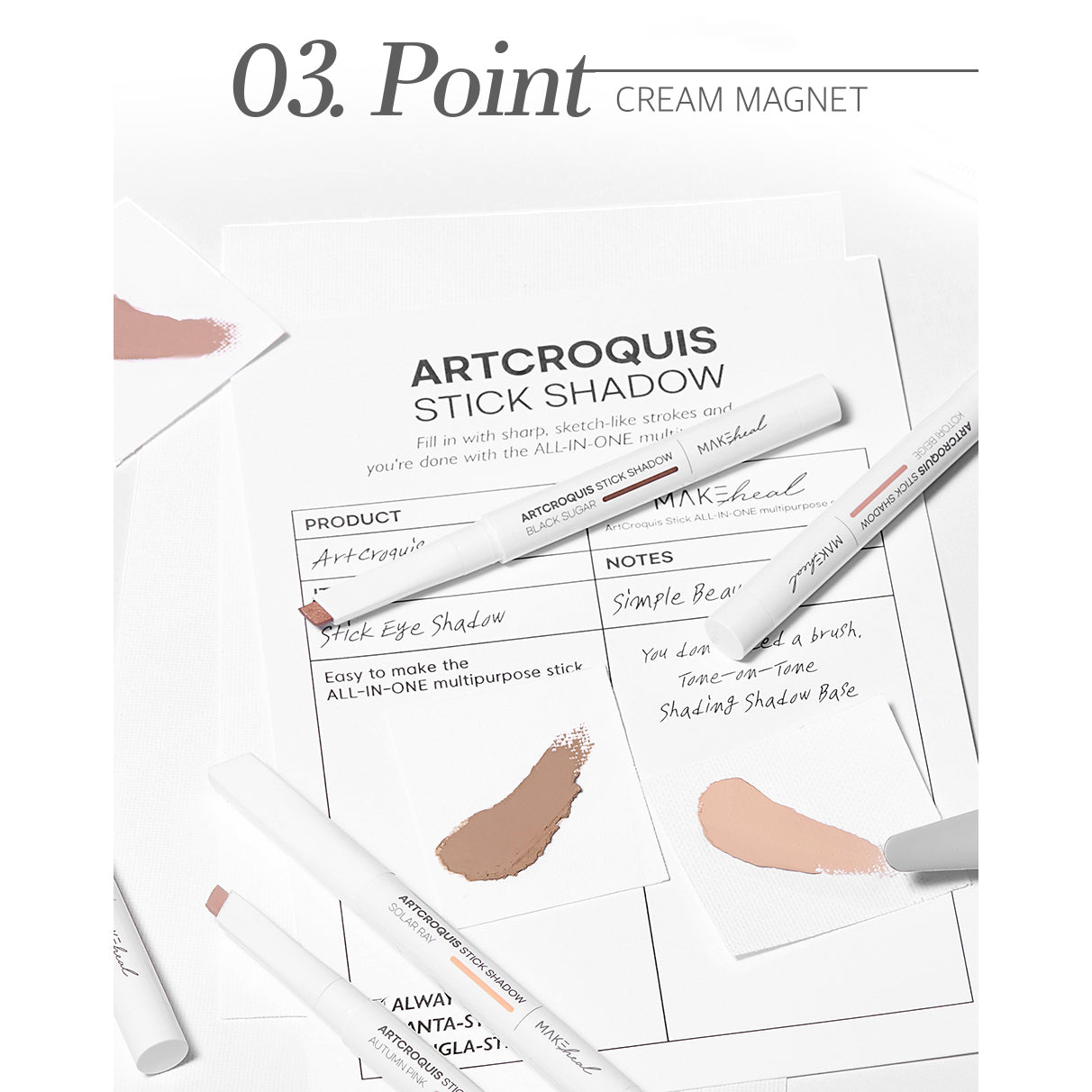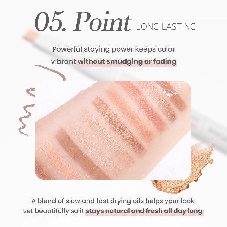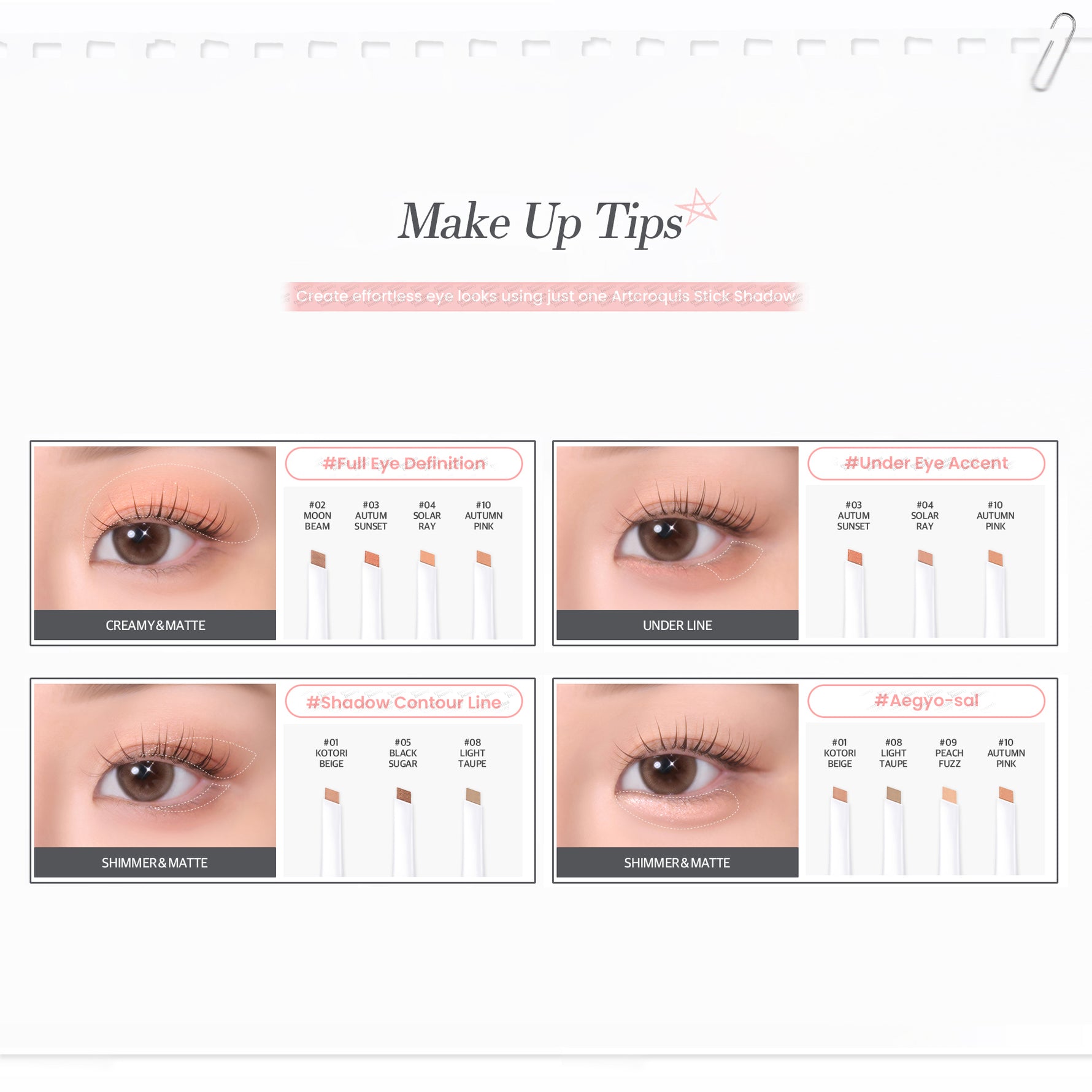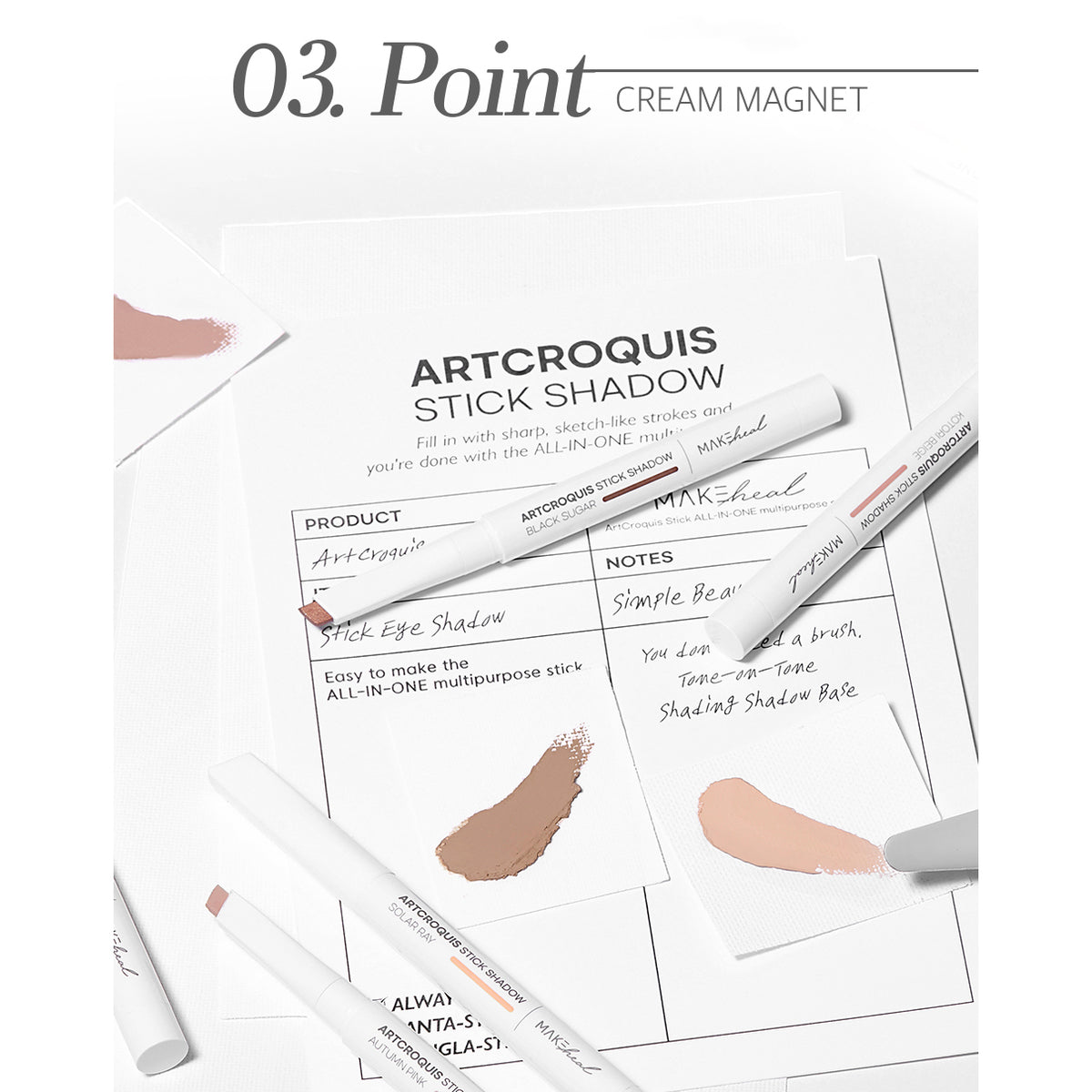 Bring artistry to your everyday eye look with the MAKEheal Artcroquis Stick Shadow. This multi-use cream-to-powder shadow glides on effortlessly, delivering buildable color in seconds. Designed with a unique square tip, it lets you draw, shade, and smudge with total control. Whether you want a soft wash of color or defined dimension, one stick can do it all. The ultra-smooth formula melts onto the skin, blending seamlessly with just a few taps of your finger. Wear it alone for a natural tone-on-tone look or mix shades to contour, highlight, and brighten. Lightweight and comfortable all day, it gives you clean color payoff without needing brushes or complicated tools. With impressive staying power, your look stays fresh and crease-free from morning to night. A blend of fast and slow setting oils helps the pigments lock in place so your makeup keeps its shape without smudging. Simple, quick, and stunning… it is eyeshadow made easy.