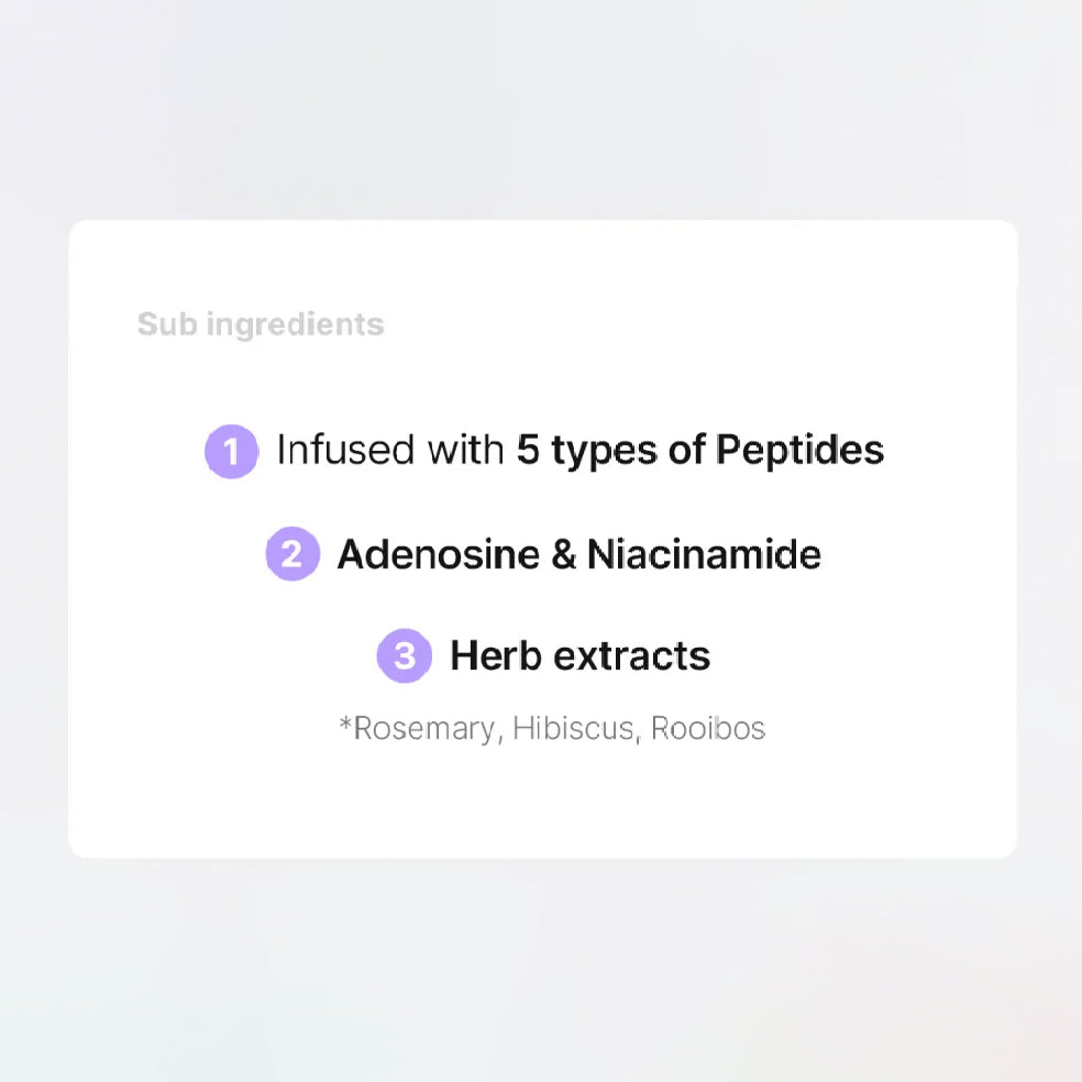 Water, Glycerin, Butylene Glycol, 1,2-Hexanediol, Caprylic/Capric Triglyceride, Dipropylene Glycol, Hydrogenated Poly (C6-14 Olefin), Niacinamide, Methyl Trimethicone, C12-16 Alcohols, Caprylic/Capric/Myristic/Stearic Triglyceride, Squalane, Cetearyl Alcohol, Persea Gratissima (Avocado) Oil, Palmitic Acid, Hydrogenated Lecithin,Chlorella Vulgaris Extract, Glucose, Stearyl Alcohol, Cetyl Alcohol, Sodium Acrylate/Sodium Acryloyldimethyl Taurate Copolymer, Hydroxyacetophenone, Polyisobutene, Fructooligosaccharides, Fructose,Glyceryl Stearate, Panthenol, Pentaerythrityl Distearate, Sodium Polyacrylate, Hydroxyethyl Acrylate/Sodium Acryloyldimethyl Taurate Copolymer, Ethylhexylglycerin, Dipotassium Glycyrrhizate, Fragrance (Parfum), Xanthan Gum, Collagen, Adenosine, Sodium Phytate, Caprylyl/Capryl Glucoside, Sorbitan Oleate, Hydrolyzed Corn Starch, Leuconostoc/Radish Root Ferment Filtrate, Sucrose, Dextrin,Theobroma Cacao (Cocoa) Seed Extract, Myristyl Alcohol, Ascorbic Acid Polypeptide, Rosmarinus Officinalis (Rosemary) Leaf Water / Aqua, Lauryl Alcohol, Aspalathus Linearis Leaf Extract, Hibiscus Sabdariffa Flower Extract, Methylpropanediol, Tocopherol, Carbomer, Dipeptide Diaminobutyroyl Benzylamide Diacetate, Palmitoyl Tripeptide-5, Polysorbate 20, Palmitoyl Tripeptide-1, Palmitoyl Tetrapeptide-7