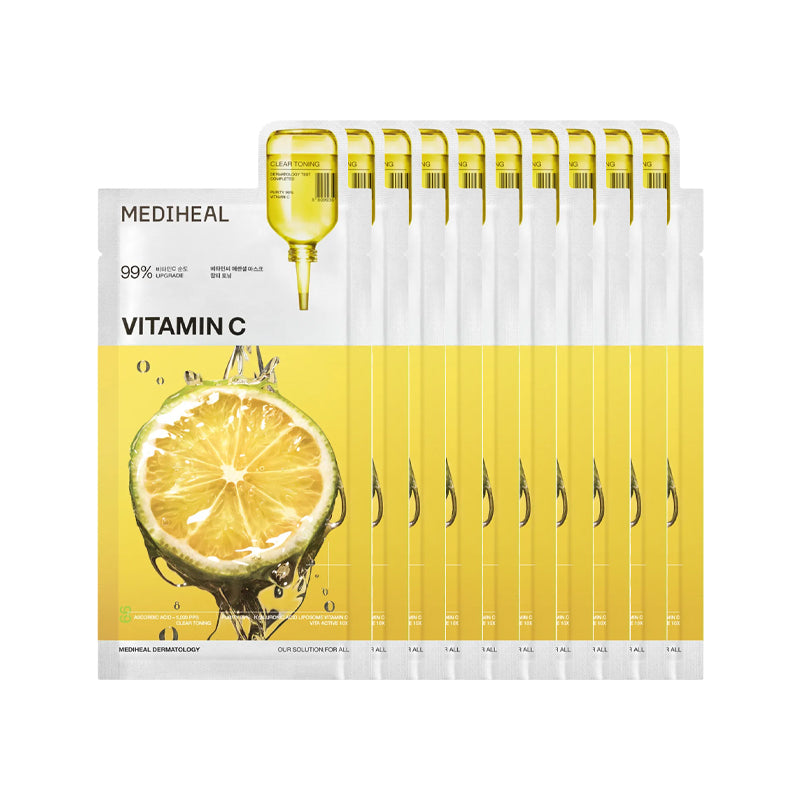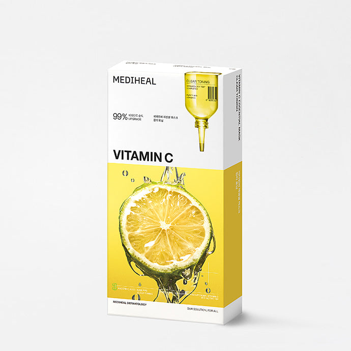 Unit price / perMEDIHEAL's Vitamin C Essential Mask Clear Toning delivers 99% Pure Vitamin C to revitalize dull, uneven skin while boosting hydration and clarity. This vegan-certified sheet mask combines hyaluronic acid, multi-vitamins, and niacinamide to brighten tone, reduce blemishes, and restore radiance without irritation. Infused with 10 essential vitamins (B1, B2, B6, B, E, K, B9, H, P, B5), niacinamide (30,000 ppm), and a refreshing citrus-herbal complex, it works to visibly improve skin’s smoothness and glow. Clinical tests show significant results: 110.23% improvement in blemishes, 101.01% clarity enhancement, and 210.9% hydration boost, making it a high-performance treatment for all skin types.