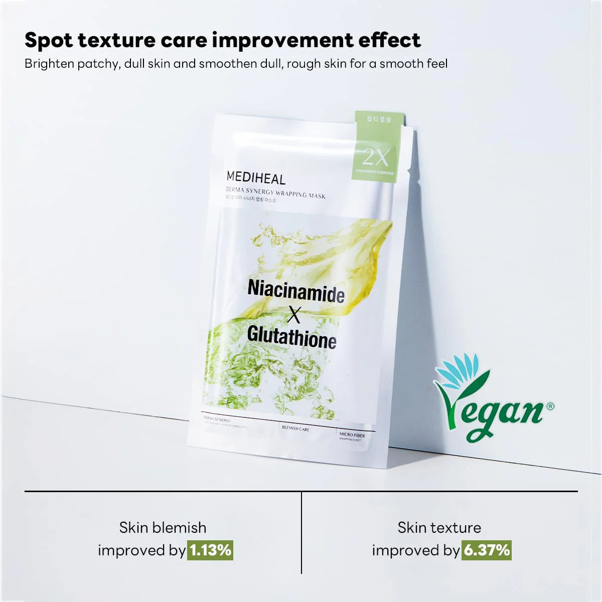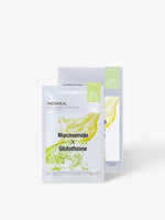 Mediheal’s Niacinamide X Glutathione Derma Synergy Wrapping Mask is a powerful skincare treatment that helps improve blemishes and texture. Proven to reduce blemishes by 1.13% and enhance skin texture by 6.37%, it works to smooth and clear your skin while brightening your complexion. Packed with niacinamide and glutathione, this mask hydrates, nourishes, and evens skin tone. Niacinamide helps reduce dark spots, while glutathione brightens and refreshes dull skin for a healthy, glowing look. With a vegan-certified sheet, it's gentle on sensitive skin and has been tested for irritation. Its unique slim-fitting design helps the active ingredients absorb more effectively, giving your skin the best results.