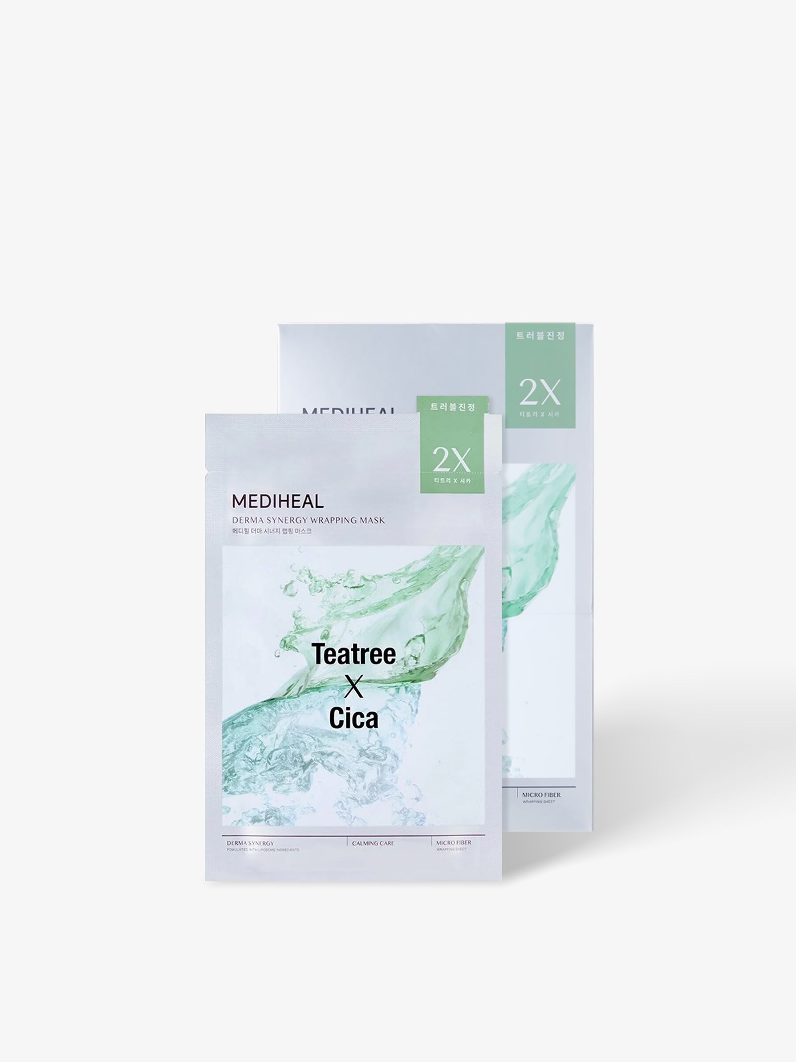 Unit price / perMediheal's Teatree X Cica Derma Synergy Wrapping Mask is designed to deeply calm and hydrate your skin. This powerful mask combines the strength of two hero ingredients—tea tree and cica—to provide intensive relief for irritated or sensitive skin. Formulated with 4X tea tree extract, it works to moisturize and soothe, while the 4X cica extract boosts your skin’s healing process, promoting a balanced and calm complexion. Ideal for acne-prone and sensitive skin types, this mild, non-comedogenic formula ensures a gentle touch without clogging pores. In just one use, skin irritation is reduced by 45.65%, helping to restore your skin’s natural balance and vitality. Not only that, the mask’s advanced liposome technology delivers active ingredients in micro-particles, allowing for deep, rapid absorption and an instant calming effect. With a vegan-certified sheet, it's gentle on sensitive skin and has been tested for irritation. Its unique slim-fitting design helps the active ingredients absorb more effectively, giving your skin the best results.
