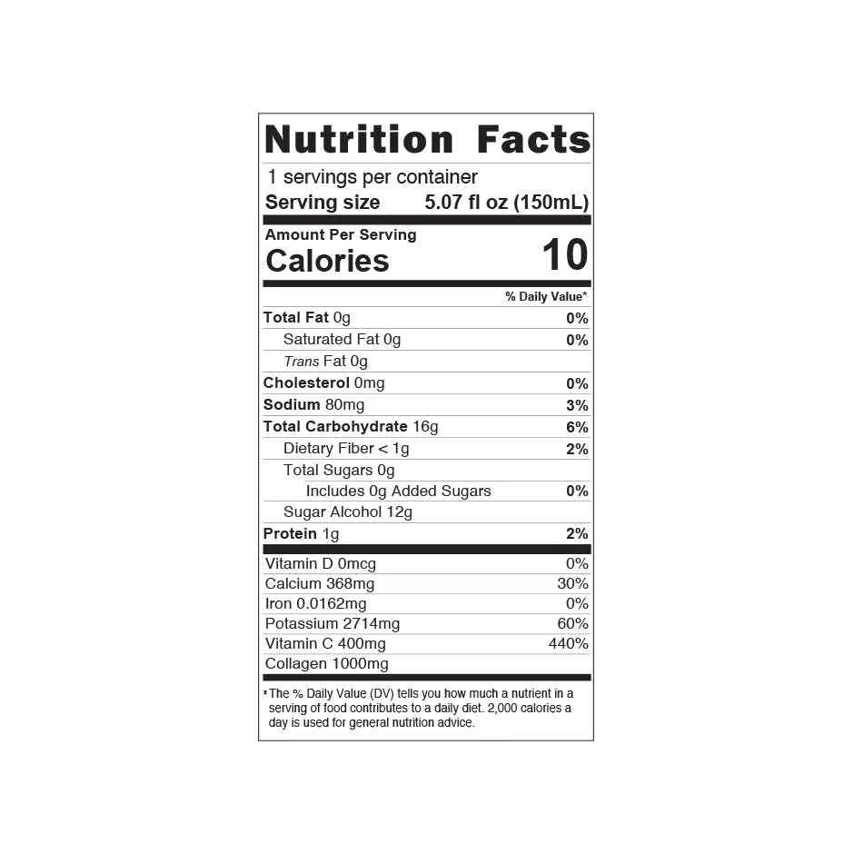 Water, Erythritol, Phyto Collagen, Mango Flavor, Vitamin C, Konjac Powder, Carrageenan, Trisodium Citrate, Citric Acid Monohydrate, Maltodextrin, Mango Extract, Gellan Gum, Xanthan Gum, Calcium Lactate, Trisodium Citrate, Sucralose