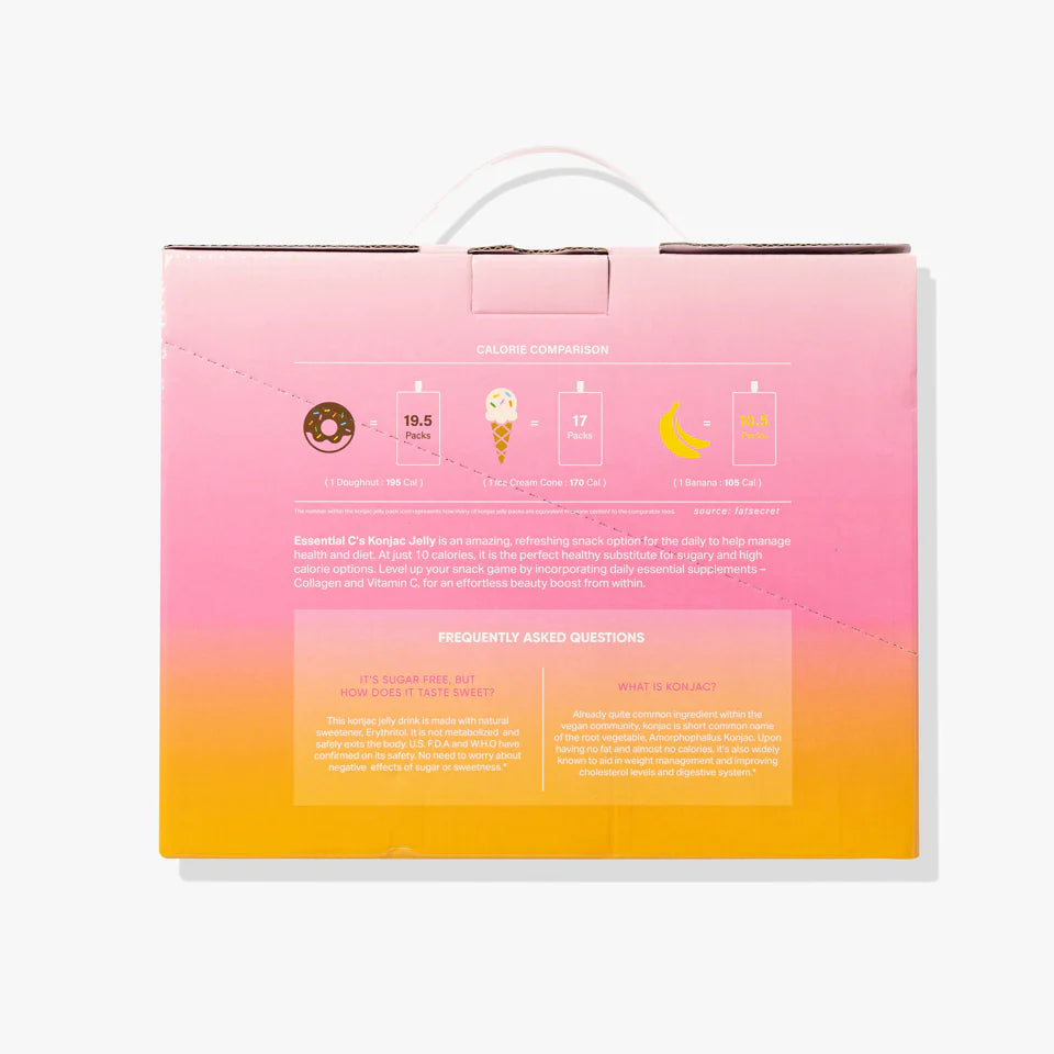 Elevate your snack time to a rejuvenating self-care experience with Essential C's Konjac Jelly. Each full pouch of Essential C's Konjac Jelly contains a mere 10 calories and delivers your essential dose of Collagen and Vitamin C. Collagen works wonders by enhancing skin elasticity and providing support for joints and muscles, while Vitamin C optimizes your immune system and promotes a bright, healthy complexion. The invigorating fruity taste and satisfyingly chewy texture make it a delightful treat for both adults and children. Its convenient travel-friendly packaging ensures that you can enjoy it wherever life takes you, making it a go-to healthy snack for any occasion.