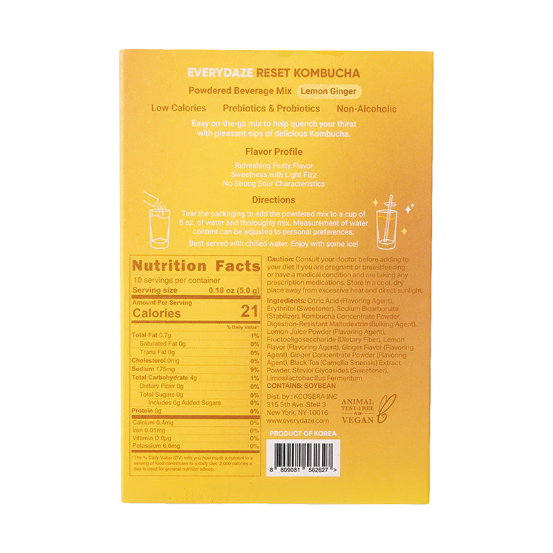 Citric Acid (Flavoring Agent), Erythritol (Sweetener), Sodium Bicarbonate (Stabilizer), Kombucha Concentrate Powder, Digestion-Resistant Maltodextrin (Bulking Agent), Lemon Juice Powder (Flavoring Agent), Fructooligosaccharide (Dietary Fiber), Lemon Flavor (Flavoring Agent), Ginger Flavor (Flavoring Agent), Ginger Concentrate Powder (Flavoring Agent), Black Tea (Camellia Sinensis) Extract Powder, Steviol Glycosides (Sweetener), Limosilactobacillus Fermentum