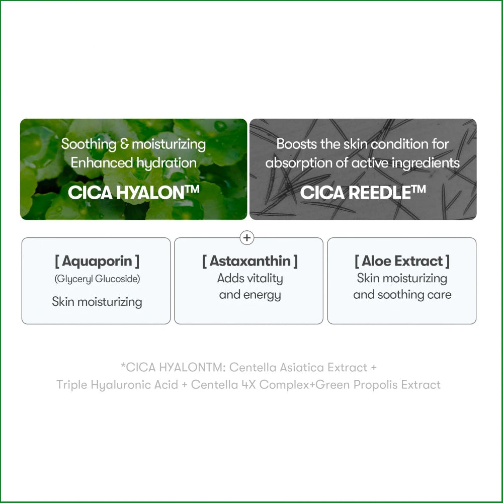 This innovative product helps restore youthful vitality by enhancing the delivery of active skincare ingredients along with the soothing benefits of cica. It includes aquaporin for intense moisturizing, astaxanthin for added vitality and energy, and aloe extract for soothing care. Additionally, Cica Hyalon™ provides soothing moisture and strengthens skin hydration, making it an ideal choice for sensitive skin. This product boosts skin absorption with Cica Reedle™, ensuring that effective ingredients are absorbed smoothly and efficiently. Its delicate shape gently stimulates the skin, waking it up and transforming it into its healthiest state. The product's mild texture and ingredients make it suitable for morning skincare routines, helping the skin absorb nutrients without any burden and maintaining a healthy condition.
