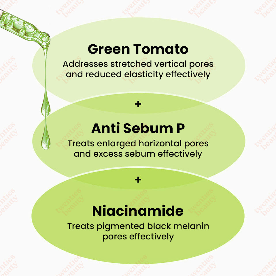 <b>[Green Tomato Pore Lifting Ampoule+]</b> Water, Butylene Glycol, Glycerin, Xylitol, 1,2-Hexanediol, Niacinamide, Dipropylene Glycol, Ethanol, Trehalose, Xanthan Gum, C12-13 Pareth-9, Carbomer, Dipotassium Glycyrrhizate, Tromethamine, Allantoin, Polymethylsilsesquioxane, Sodium Citrate, Adenosine, Melia Azadirachta Leaf Extract, Melia Azadirachta Flower Extract, Styrene/Acrylates Copolymer, Solanum Lycopersicum (Tomato) Fruit Extract, Bellis Perennis (Daisy) Flower Extract, Hydrolyzed Collagen, Panthenol, Gluconolactone, Coccinia Indica Fruit Extract, Amber Powder, Solanum Melongena (Eggplant) Fruit Extract, Ocimum Sanctum Leaf Extract, Curcuma Longa (Turmeric) Root Extract, Corallina Officinalis Extract, Moringa Oleifera Seed Oil, Hydrogenated Polyisobutene, Hydrogenated Lecithin, Sodium Hyaluronate, Ceramide NP, Hyaluronic Acid, Hydrolyzed Hyaluronic Acid, Hydroxypropyltrimonium Hyaluronate, Sodium Hyaluronate Crosspolymer, Pueraria Lobata Root Extract, Pinus Palustris Leaf Extract, Ulmus Davidiana Root Extract, Oenothera Biennis (Evening Primrose) Flower Extract, Anemarrhena Asphodeloides Root Extract, Ethylhexylglycerin, Methyldihydrojasmonate, Disodium EDTA, Phenethyl Alcohol, Sodium Chloride, Disodium Phosphate, Potassium Chloride, Potassium Phosphate, Ethyl Linalool, Ethylene Brassylate, Linalyl Acetate, Eucalyptol, Methylenedioxyphenyl Methylpropanal, 2-t-Butylcyclohexyl Acetate, Hexenyl Acetate, 3-Hexenol, 2,4-Dimethyl-3-Cyclohexene Carboxaldehyde, Benzyl Glycol, Tocopherol, Raspberry Ketone