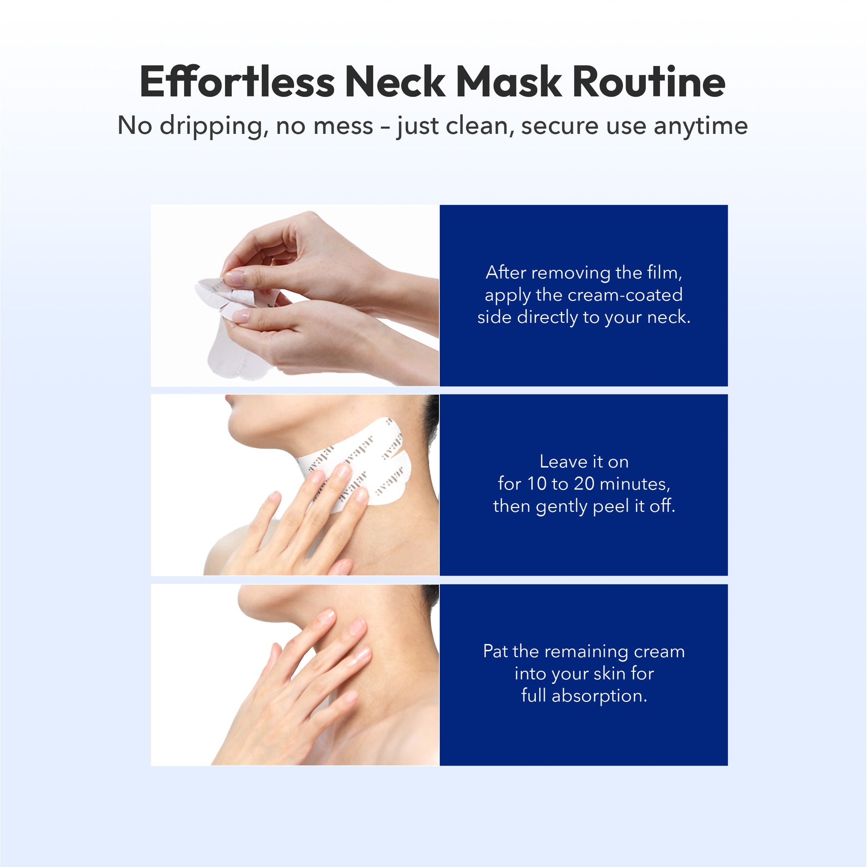 <br>2. Apply the cream coated side directly to the neck area. Leave it on for 10~20 minutes, then gently remove the mask.