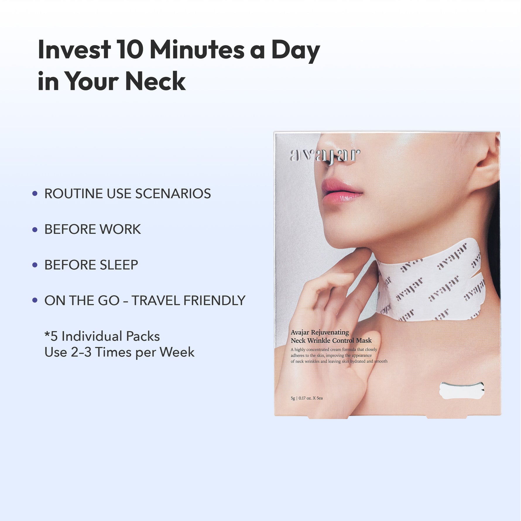 Elevate your neck care routine with Avajar’s clinically trusted innovation. This advanced hydrogel mask is designed to target fine lines, wrinkles, and sagging in the delicate neck area with precision care and deep hydration. Simply peel, apply, and lift for visible results without the need for messy creams. Infused with PDRN, 6 peptides, Rejubebe™, niacinamide, and ceramide, the mask helps restore elasticity, smooth deep lines, and lock in lasting hydration. Its cream-infused core penetrates deeply, while the urethane-coated soft rayon fabric ensures maximum absorption and a comfortable, secure fit.