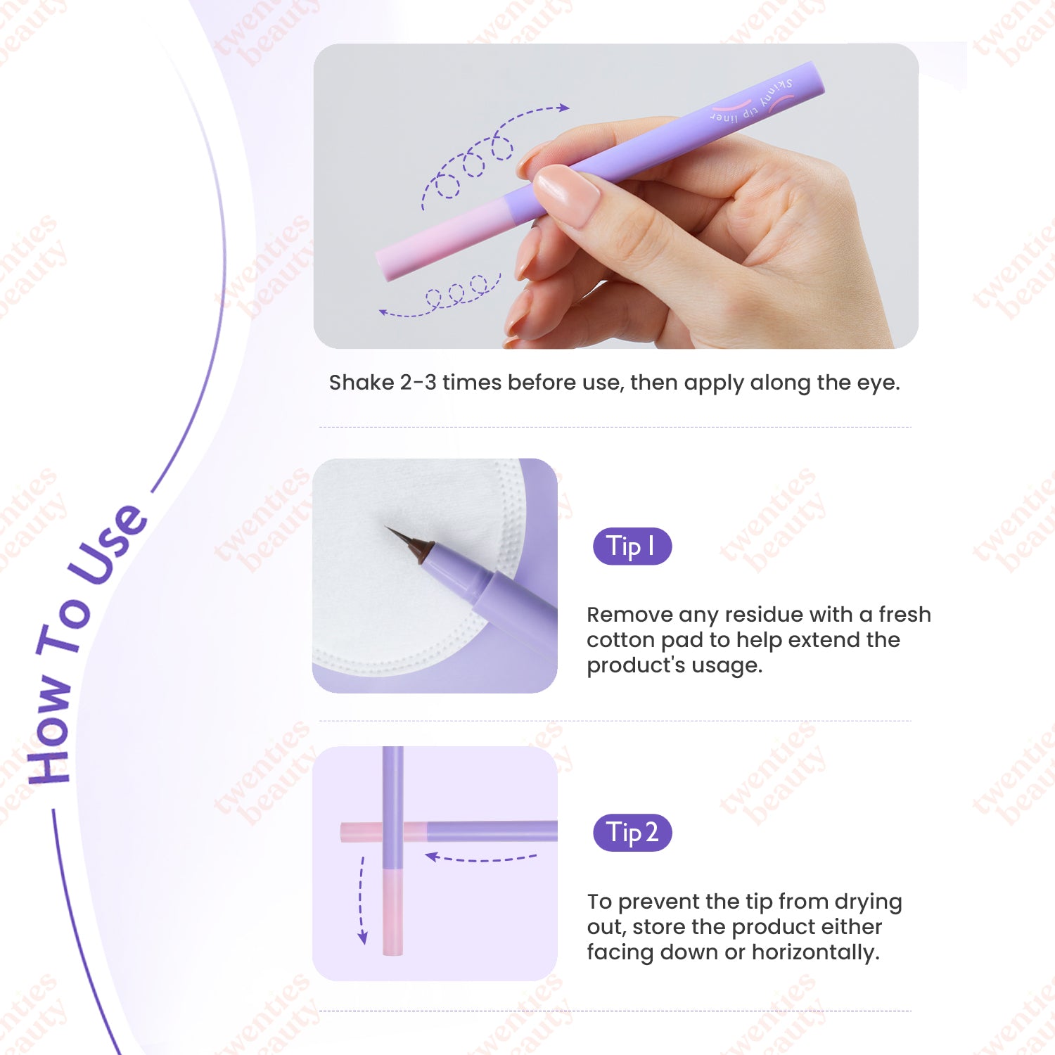 <br> 3. Aplicar sobre base y sombra de ojos puede acumular residuos en la punta, dificultando el flujo del producto. Para mantener la punta limpia, límpiela suavemente con un pañuelo de papel antes de usarla cuando sea necesario.
