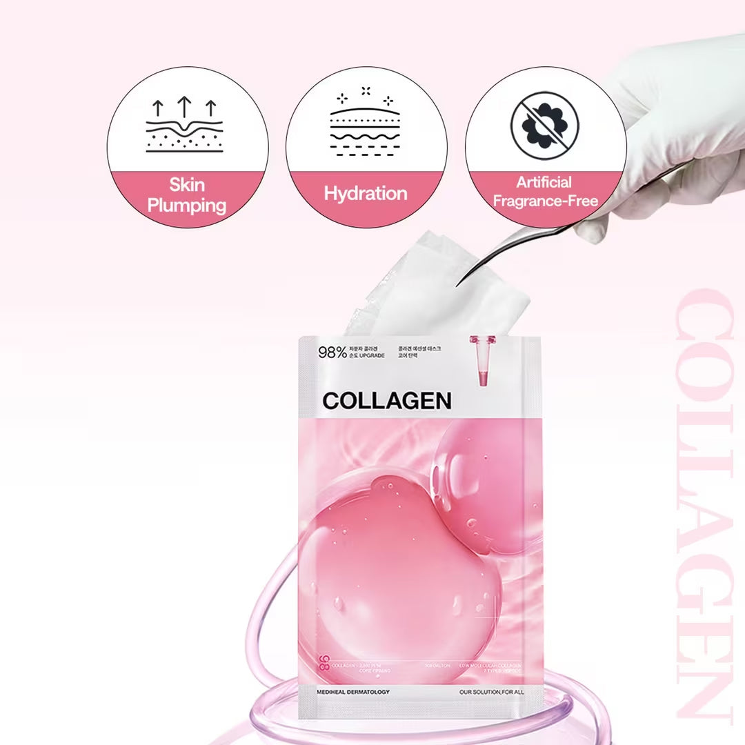 Precio unitario / porExperience a firmer, plumper, and more hydrated complexion with MEDIHEAL’s Collagen Essential Mask. Infused with 98% pure collagen, this mask is designed to target both surface and inner skin layers, helping to visibly improve elasticity, density, and firmness with just one application. Its triple-refined, ultra-fine 300-dalton collagen penetrates deep into the skin, with particles 1/35,000 the size of pores for maximum absorption and results.
