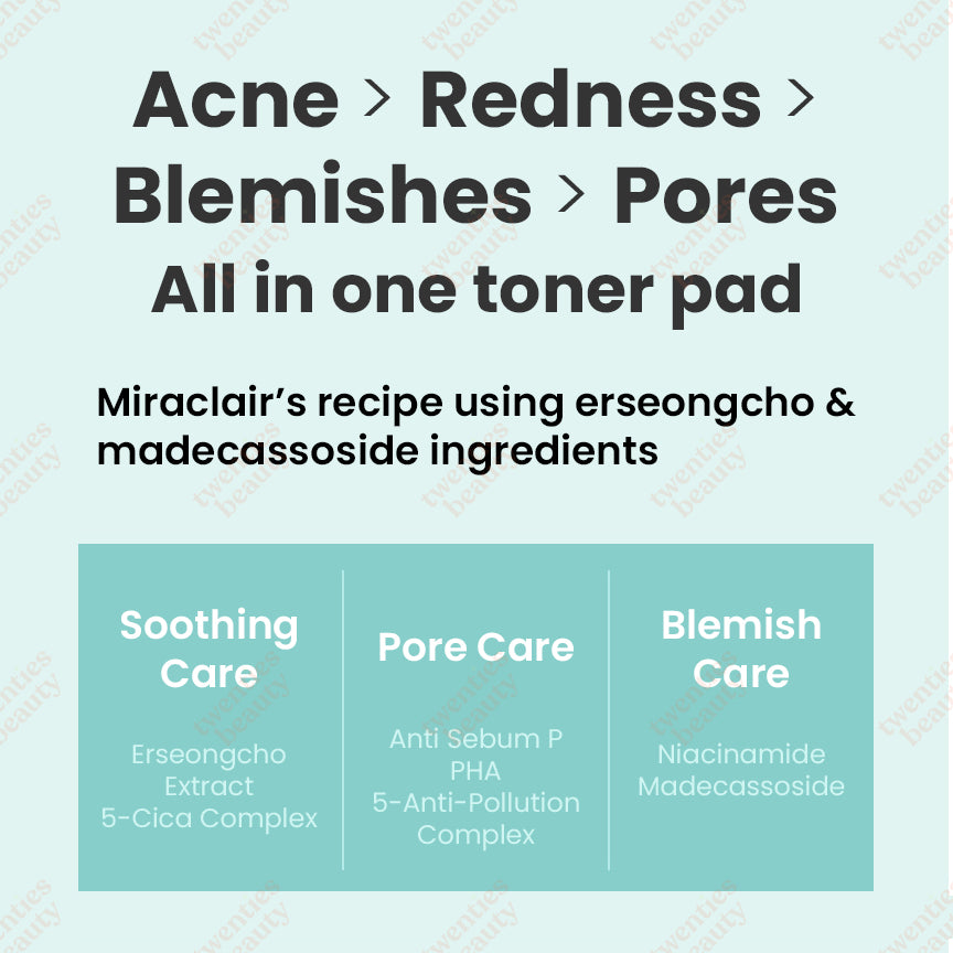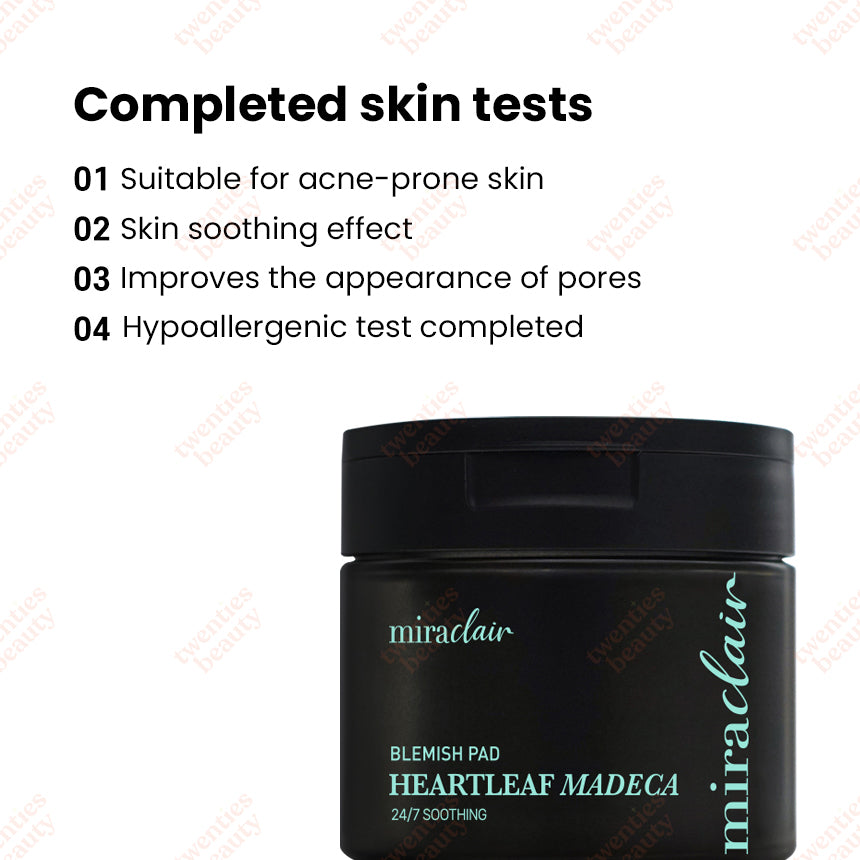 Las almohadillas antiimperfecciones Heartleaf Madeca de Miraclair están repletas de ingredientes clave como erseongcho, complejo 5-cica y niacinamida. Estas almohadillas están formuladas para combatir las imperfecciones y aliviar la piel irritada. Aprovechando el poder de la naturaleza, la exclusiva mezcla de Miraclair, "Anti-Sebum P", combina extractos como la hoja de pinus palustris y la flor de onagra para combatir el exceso de grasa y minimizar la apariencia de los poros. El erseongcho, derivado de la hoja de corazón, enriquecido con quercitrina, fortalece las células cutáneas y combate la fatiga, dejando la piel fresca y revitalizada.