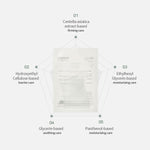 Agua, butilenglicol, glicerina, extracto de centella asiática, 1,2-hexanodiol, hidroxiacetofenona, goma xantana, carbómero de sodio, hidroxietilcelulosa, etilhexilglicerina, EDTA disódico.