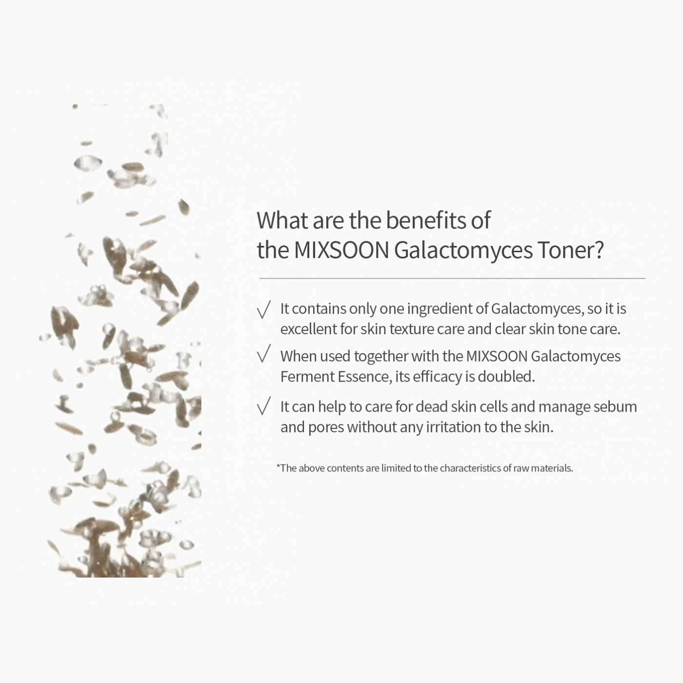 El Tónico de Galactomyces de Mixsoon está formulado para iluminar el tono de la piel, reducir las decoloraciones y abordar diversos problemas como la opacidad, el tono desigual, los poros visibles, la falta de nutrición e hidratación, así como la disminución de la elasticidad y la vitalidad. Con 100 % de filtrado de fermento de galactomyces, este tónico mejora la tez apagada, proporcionando una excelente hidratación e hidratación. Ayuda a crear una tez de aspecto transparente a la vez que suaviza la textura de la piel, dejándola con una apariencia y sensación de rejuvenecimiento. También ofrece un efecto exfoliante, reduciendo la producción excesiva de sebo para una luminosidad equilibrada y saludable. Sin alcohol ni perfume, el Tónico de Galactomyces de Mixsoon es suave con la piel, por lo que es apto para todo tipo de piel, incluso las más sensibles.