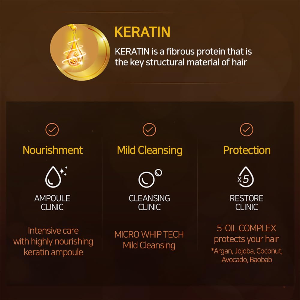 Transform extremely damaged hair into silky smooth strands with the KERASYS Advanced Repair Ampoule Shampoo. Formulated with a highly nourishing keratin complex, this advanced shampoo helps restore strength, softness, and elasticity while gently cleansing the scalp and hair. Infused with Micro Whip Tech for mild yet effective cleansing, it removes impurities without stripping away essential moisture. The 5-Oil Complex (argan, jojoba, coconut, avocado, and baobab) provides intensive hydration and protection, sealing in nutrients and shielding hair ends from breakage and split ends.
