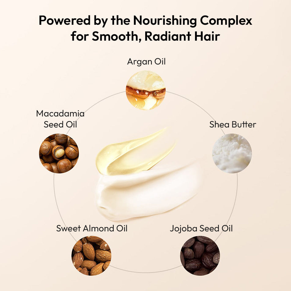 Formulated with oil extracted from the fruit of the argania tree, it contains more than twice the vitamin E of olive oil to strengthen and revitalize dull hair. The blend of argan oil, macadamia seed oil, sweet almond oil, jojoba seed oil, and shea butter creates a nourishing complex that smooths rough texture, reduces frizz, and restores hair’s natural radiance.