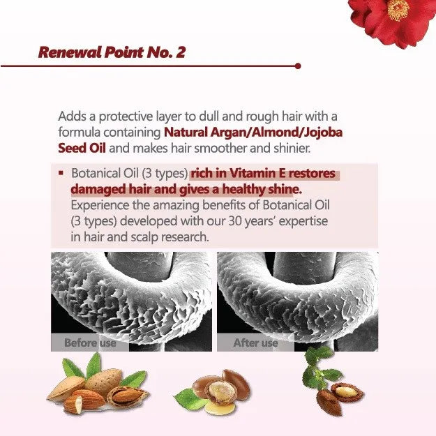 Infused with twice the concentration of camellia japonica seed oil, it delivers deep hydration and protection with fatty acids that closely mimic natural sebum, keeping hair silky and resilient. A blend of argan, almond, and jojoba oils creates a protective layer that smooths rough strands and adds a luminous shine. The advanced plant-based Protein 5 Complex (soy, wheat, rice, cotton seed, and barley proteins) penetrates hair fibers to repair internal damage, reduce breakage, and improve elasticity. With each wash, the scalp feels refreshed, and hair is left stronger, smoother, and more radiant.