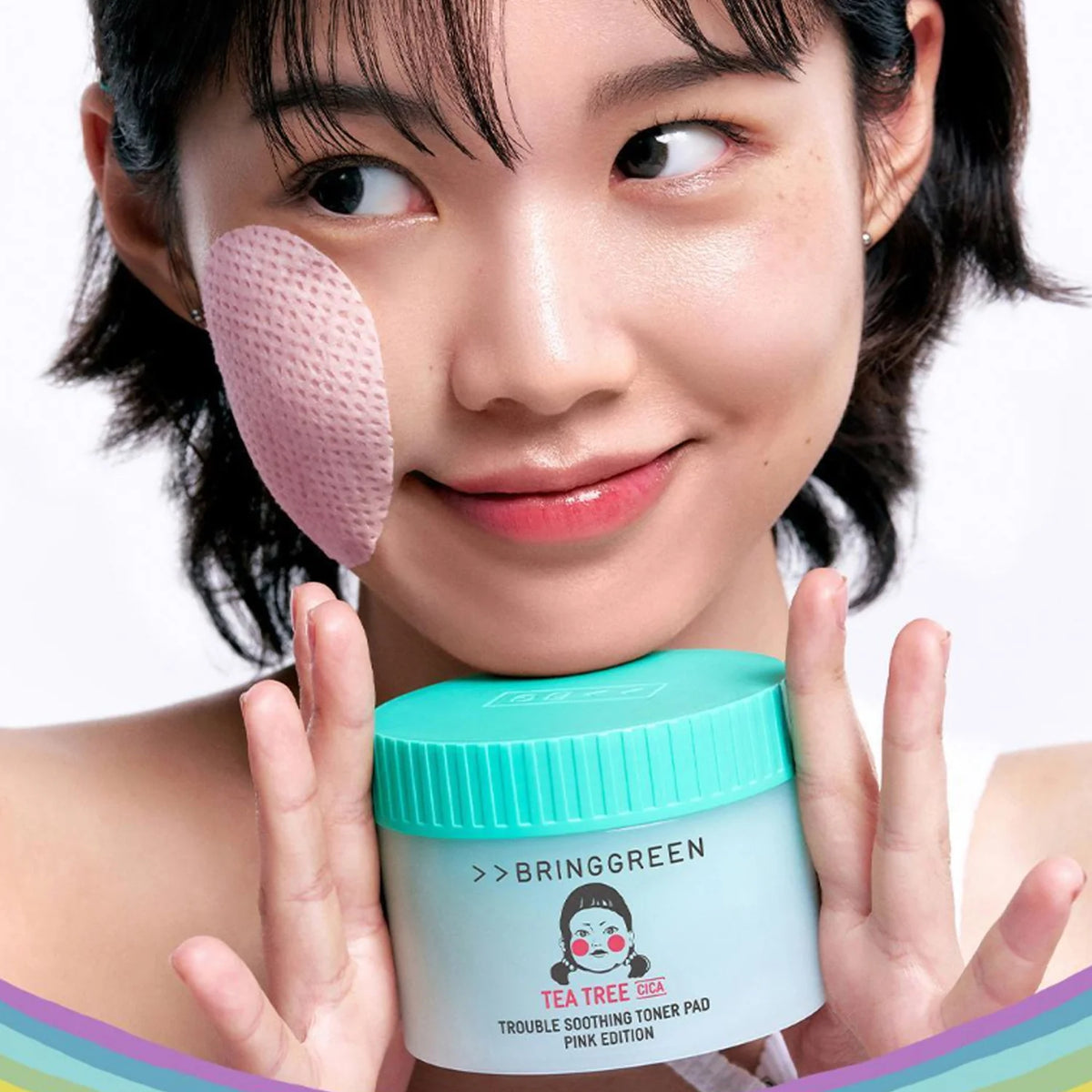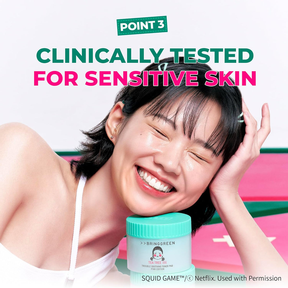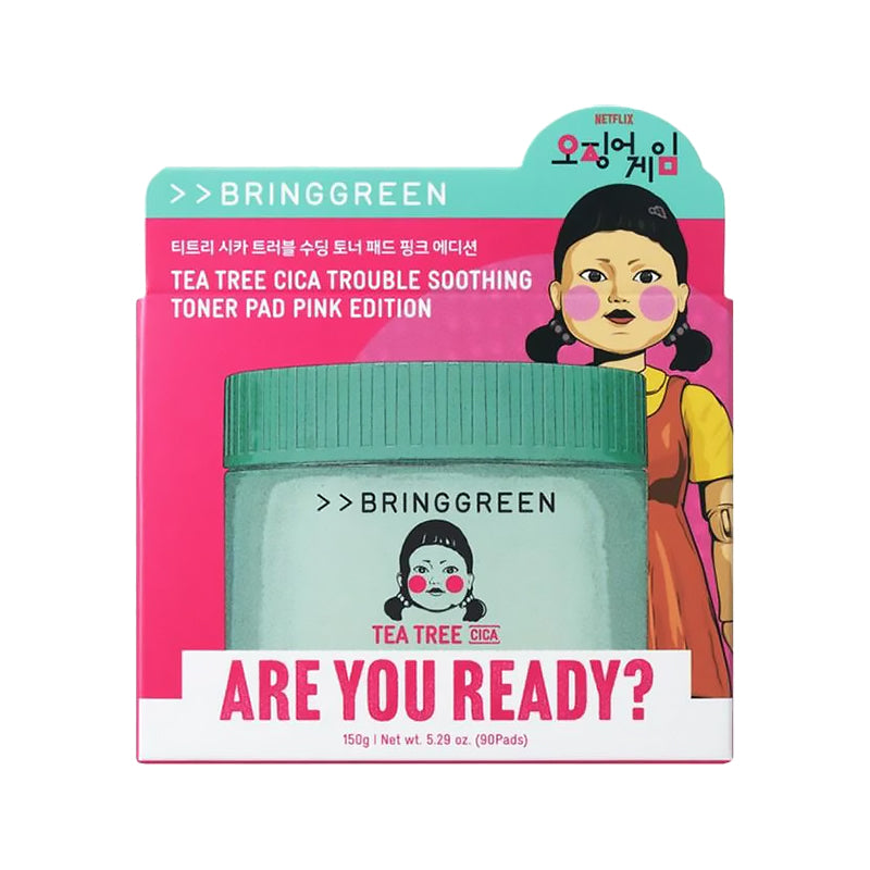 Inspirada en la icónica Young Hee de El Juego del Calamar, la Almohadilla Calmante de Cica de Árbol de Té de BRINGGREEN está diseñada para calmar y reconfortar la piel enrojecida e irritada, igual que las características mejillas sonrosadas de Young Hee. Esta edición limitada, en colaboración con El Juego del Calamar de Netflix, presenta una fórmula poco irritante, lo que la convierte en la solución perfecta para pieles sensibles con tendencia acneica que necesitan un alivio calmante.