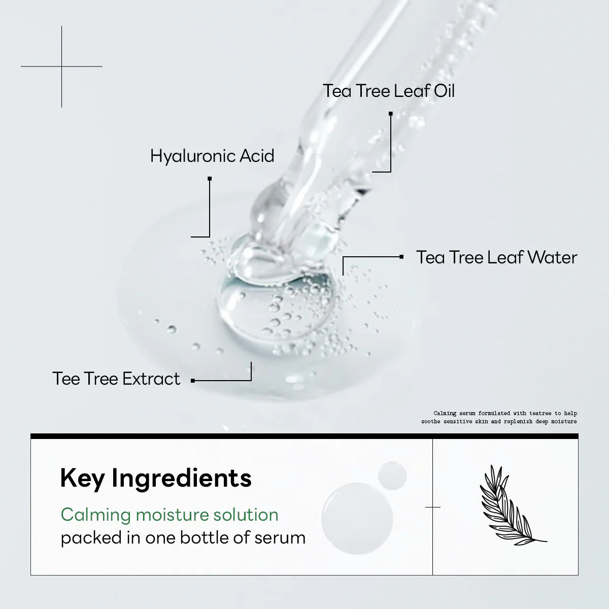 Water, Glycerin, Butylene Glycol, 2,3-Butanediol, Methylpropanediol, 1,2-Hexanediol, Melaleuca Alternifolia (Tea Tree) Leaf Water, Panthenol, C12-14 Alketh-12, Sodium Hyaluronate, Carbomer, Tromethamine, Ammonium Acryloyldimethyltaurate/VP Copolymer, Ethylhexylglycerin, Allantoin, Melaleuca Alternifolia (Tea Tree) Leaf Oil, Xanthan Gum, Melaleuca Alternifolia (Tea Tree) Extract, Melaleuca Alternifolia (Tea Tree) Leaf Extract, Beta-Glucan, Tocopherol, 4-Terpineol, Zinc PCA, Dipropylene Glycol, Pentylene Glycol, Caprylyl/Capryl Glucoside, Hydrogenated Lecithin, Ceramide NP