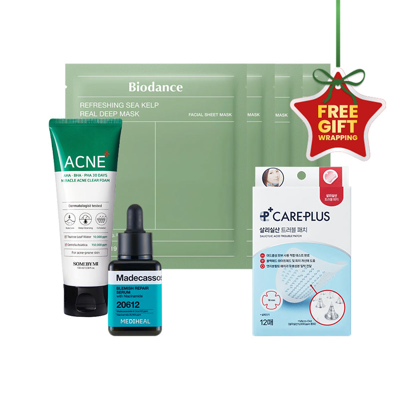 Start with the refreshing cleanser that removes impurities and buildup without stripping the skin. Follow with the targeted serum that helps clarify pores, reduce the look of blemishes, and even out discoloration from past breakouts. The soothing mask adds an extra boost of care, helping calm redness and inflammation while restoring hydration. For active pimples, the salicylic acid patch works to absorb impurities, shrink the spot, and protect the area for faster recovery.
