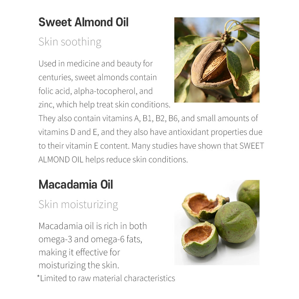 Enhance your skin’s elasticity with palmitoyl tripeptide-5 and enjoy improved hydration with MOISTBOOM®. This advanced formula also includes adenosine and niacinamide to brighten your complexion and support skin elasticity, leaving your skin looking radiant and youthful. Sweet almond oil and macadamia oil work in harmony to deliver soothing, deep moisture, ensuring your skin remains hydrated all day long. Coconut extract helps balance the skin’s pH, purify, and calm dry skin, providing a gentle touch with a rejuvenating effect.