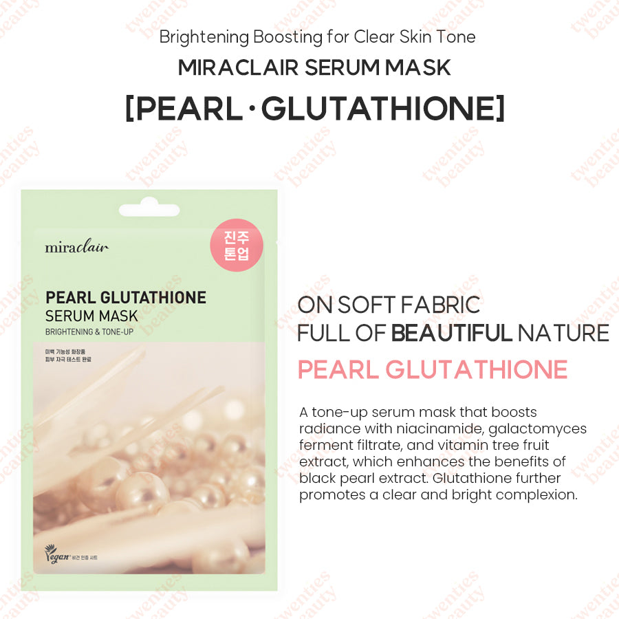 Miraclair's Pearl Glutathione Serum Mask is a brightening powerhouse that delivers radiant, clear skin. Infused with niacinamide, galactomyces fermentation filtrate, and vitamin-rich fruit extracts, this mask amplifies the brightening effects of black pearl extract and glutathione for a luminous complexion. Hippophae rhamnoides fruit extract further enhances the skin's brightness, while allantoin provides deep hydration. Designed to adhere seamlessly to your face, this vegan-formulated mask is gentle and safe for sensitive skin, making it the perfect choice for achieving a glowing, refreshed look.