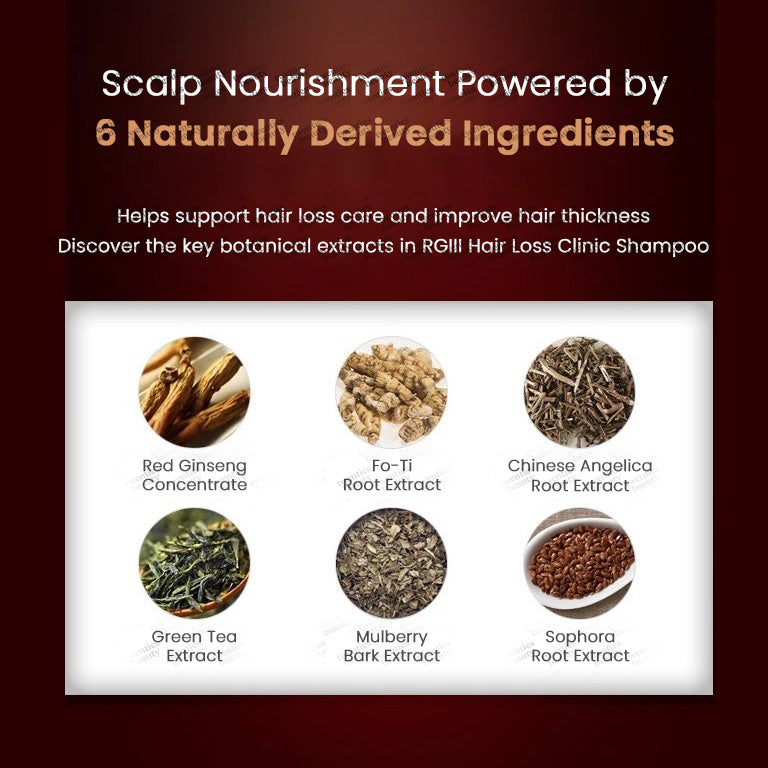 The RGIII Premium Shampoo features 2X red ginseng extract at 2,000 ppm to help fortify hair at the root and promote a healthier scalp environment. Formulated with premium Korean red ginseng that has passed rigorous quality testing, it blends traditional herbal ingredients with modern clinical research. A rich, cushiony foam gently removes buildup while nourishing the scalp without leaving it feeling tight or stripped. Infused with six naturally derived botanical extracts including red ginseng concentrate, green tea, mulberry bark, fo ti root, Chinese angelica root, and sophora root, the shampoo helps reduce visible hair shedding and improve overall hair vitality for fuller, denser looking strands.