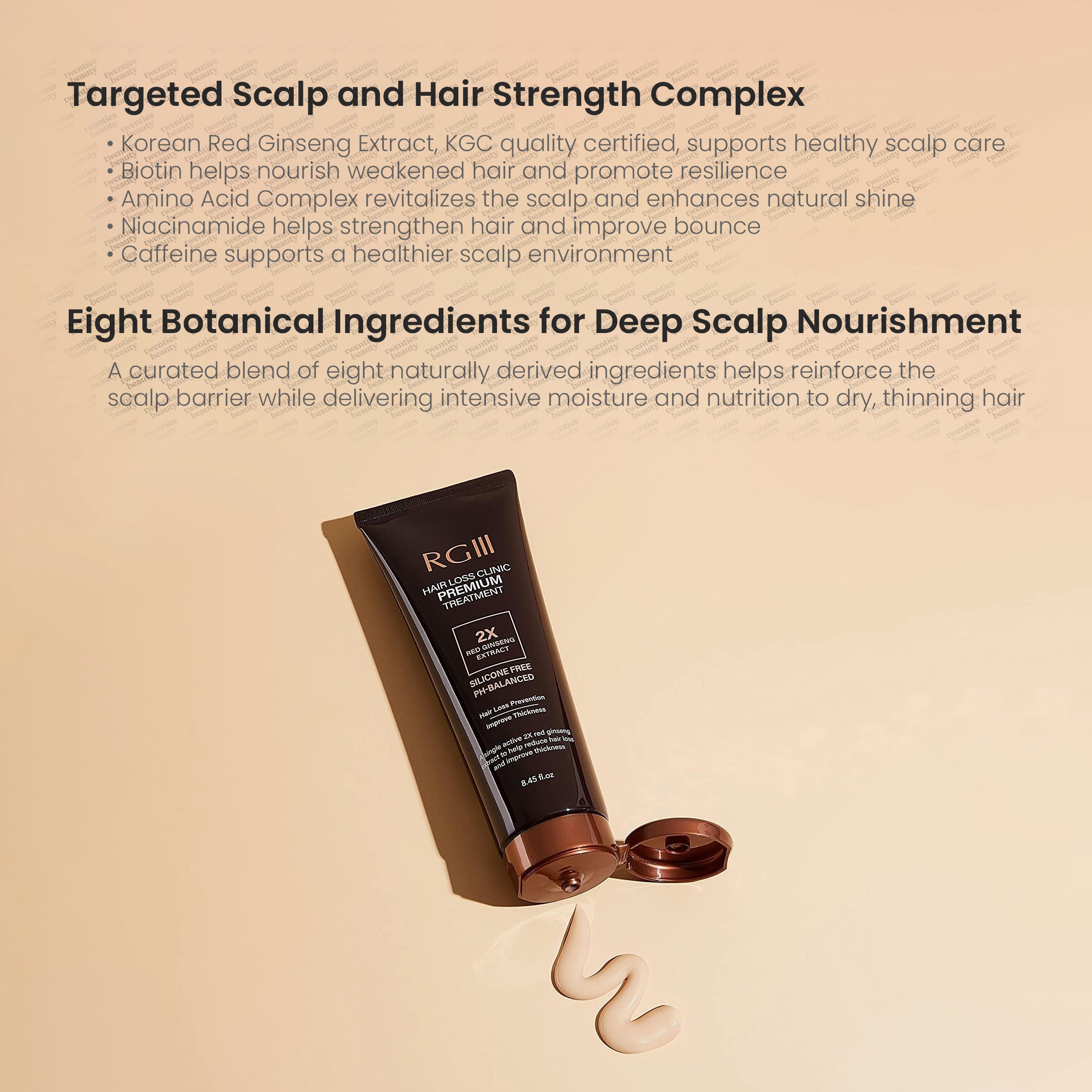 The RGIII Premium Treatment enhances results with a high concentration of 2X red ginseng extract at 4,000 ppm. This silicone free, pH balanced formula deeply nourishes both scalp and hair while supporting improved thickness and bounce. Enriched with red ginseng extract, biotin, amino acids, niacinamide, and caffeine, along with eight natural ingredients that help strengthen the scalp barrier, the treatment smooths texture, boosts shine, and reinforces weakened strands without heaviness. Together, this set delivers stronger, healthier looking hair with consistent use.