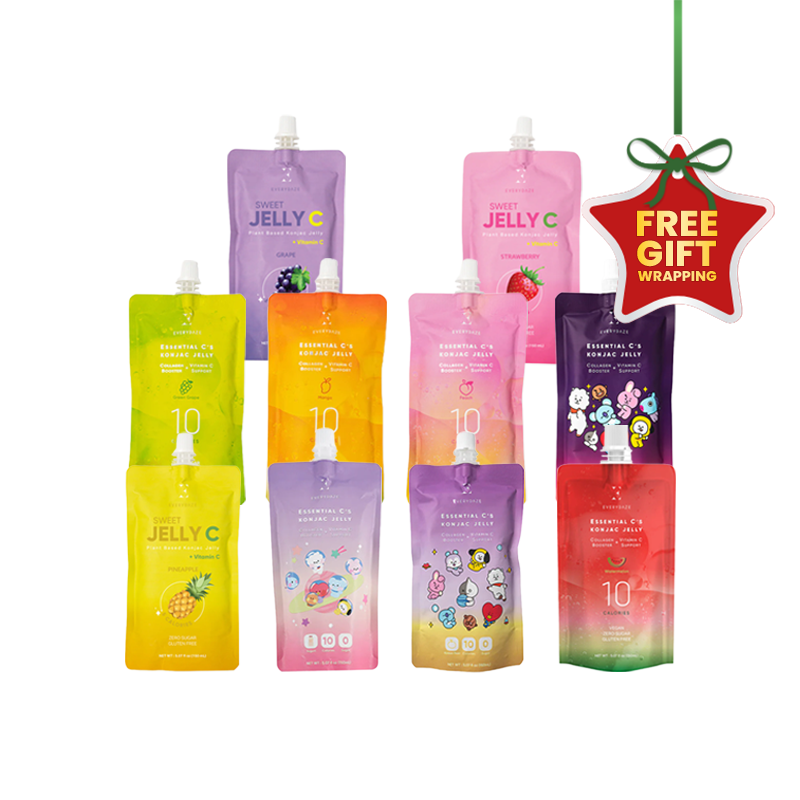 Celebrate the holidays with a cheerful, candy bright selection of konjac jellies crafted for wellness lovers. Our Sweet Konjac Jelly Sampler Bundle features ten refreshing flavors, each packed with juicy sweetness and a boost of Vitamin C or Collagen plus Vitamin C. This festive assortment includes three Sweet Jelly C flavors made with Vitamin C for a bright, tangy lift: Grape Sweet Jelly C, Strawberry Sweet Jelly C, and Pineapple Sweet Jelly C. Alongside them are seven Essential C’s Konjac Jelly flavors enriched with Collagen plus Vitamin C for extra glow: Yogurt, Korean Pear, Watermelon, Green Grape, Mango, Peach, and Lychee. Each pouch is low calorie, refreshing, and bursting with its own unique fruit inspired taste. Whether you’re sharing them with loved ones or keeping them all for yourself, this festive assortment adds a playful touch to Christmas snacking. Chill, shake, and squeeze for a refreshing moment of joy. Gift the flavor, keep the fun.