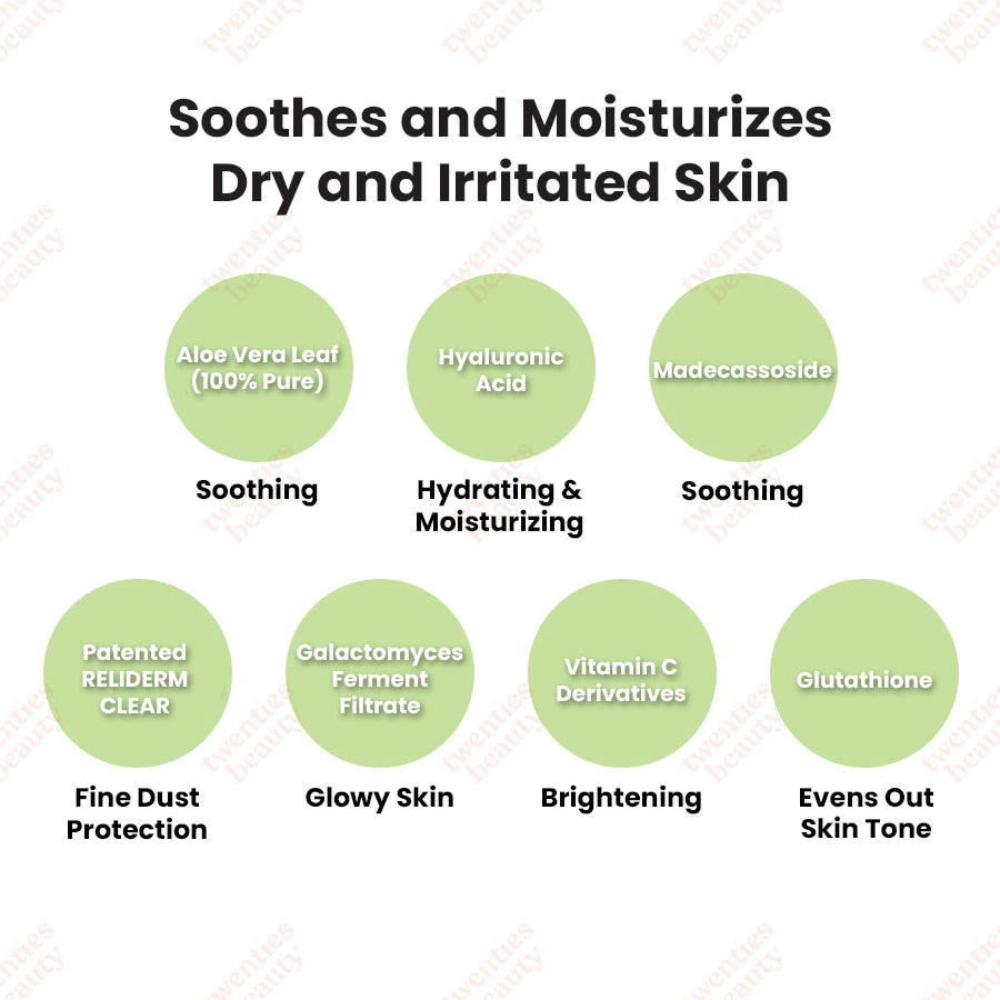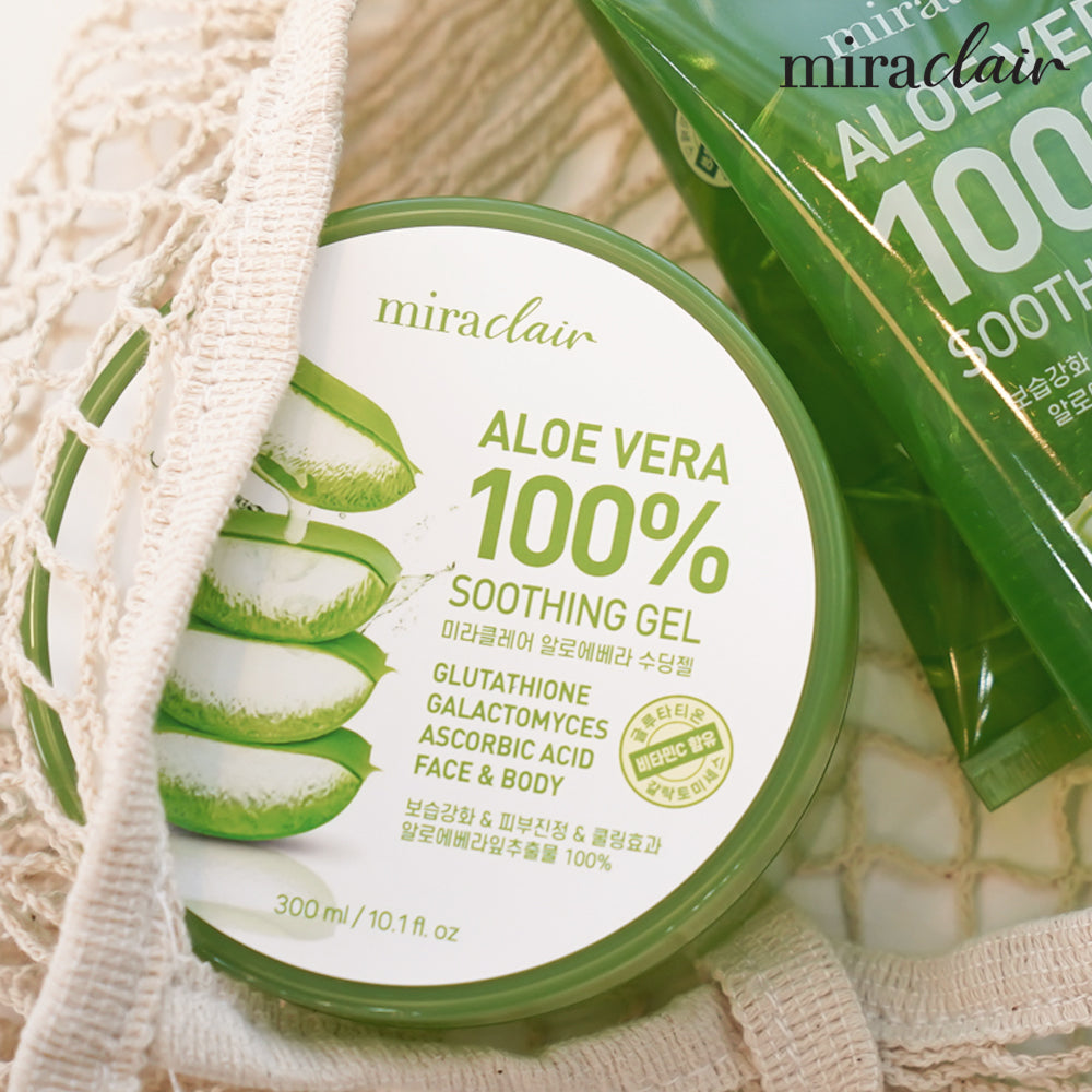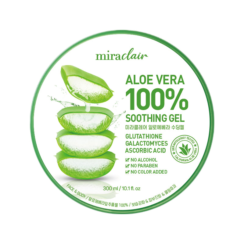 Miraclair 100% 芦荟舒缓凝胶蕴含纯正芦荟提取物,并富含柿叶提取物、茶叶提取物、海带提取物和尿囊素,能够深层补水,舒缓肌肤。这款清爽凝胶能够舒缓干燥、刺激和泛红的肌肤,同时持久保湿。采用获得专利的 RELIDERM CLEAR 技术,可形成保护膜,抵御细小灰尘和环境压力,保持肌肤清洁健康。配方中还添加了半乳糖酵母发酵滤液,令肌肤焕发光彩;维生素 C 衍生物提亮肤色;谷胱甘肽则能够均匀肤色,令肌肤光彩照人、均衡饱满。