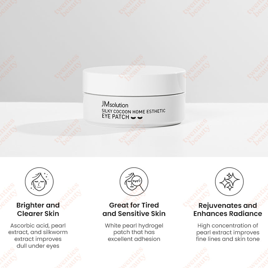 JMsolution 丝滑茧居家美颜眼贴旨在提亮和焕活疲惫双眸。这款眼贴采用白色珍珠水凝胶材质制成,贴合舒适,确保贴合牢固,同时有效释放其功效成分。眼贴蕴含高浓度珍珠提取物、抗坏血酸和蚕蛹提取物,可有效淡化暗沉,改善细纹和肤色不均。烟酰胺的添加进一步增强了其提亮效果,有助于均匀肤色,消除暗沉。这种强效组合还能提升肌肤弹性,令肌肤更紧致、更年轻。眼贴采用弧形设计,完美贴合眼周肌肤,提供大面积覆盖和深层滋养。
