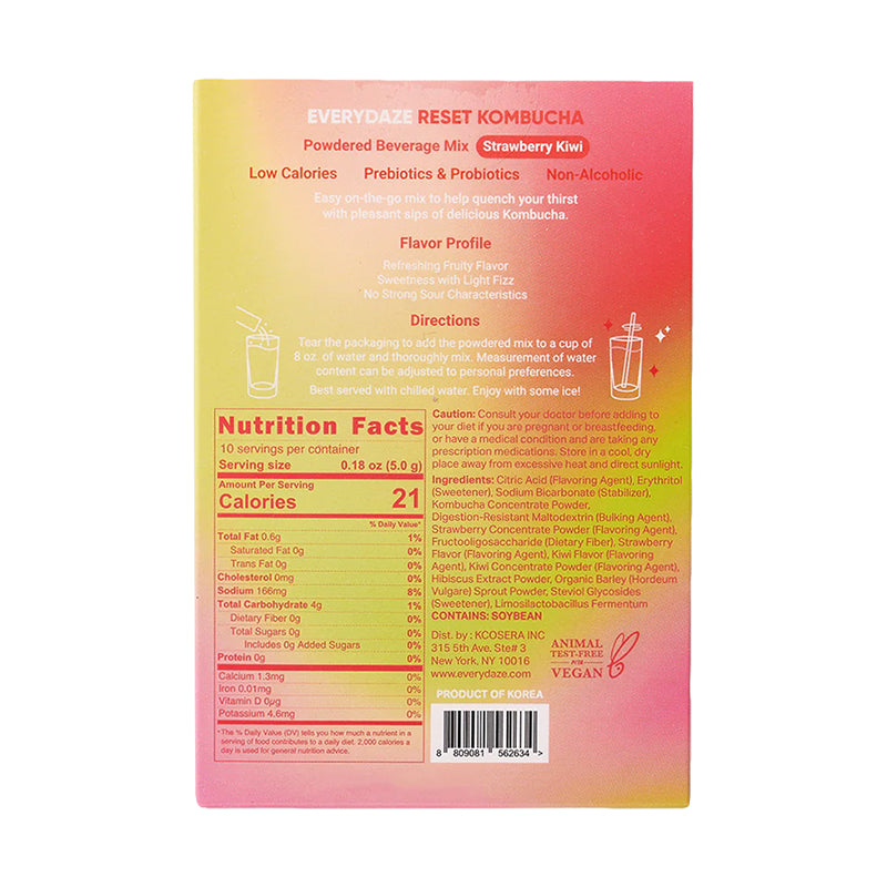 EVERYDAZE Reset 康普茶粉以健康和饮食需求为导向,精心制作而成。它不含植物成分,低卡路里,咖啡因含量极低。粉末采用赤藓糖醇和甜菊糖等天然成分增甜,避免添加糖和卡路里。该配方在最终产品中不含酒精,因为发酵过程中产生的酒精会在灭菌和将康普茶转化为粉末的过程中蒸发掉。