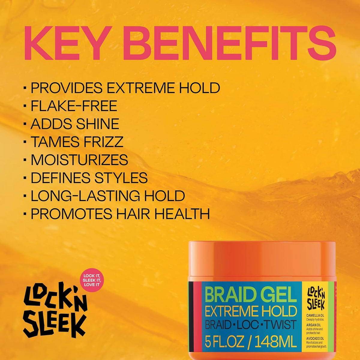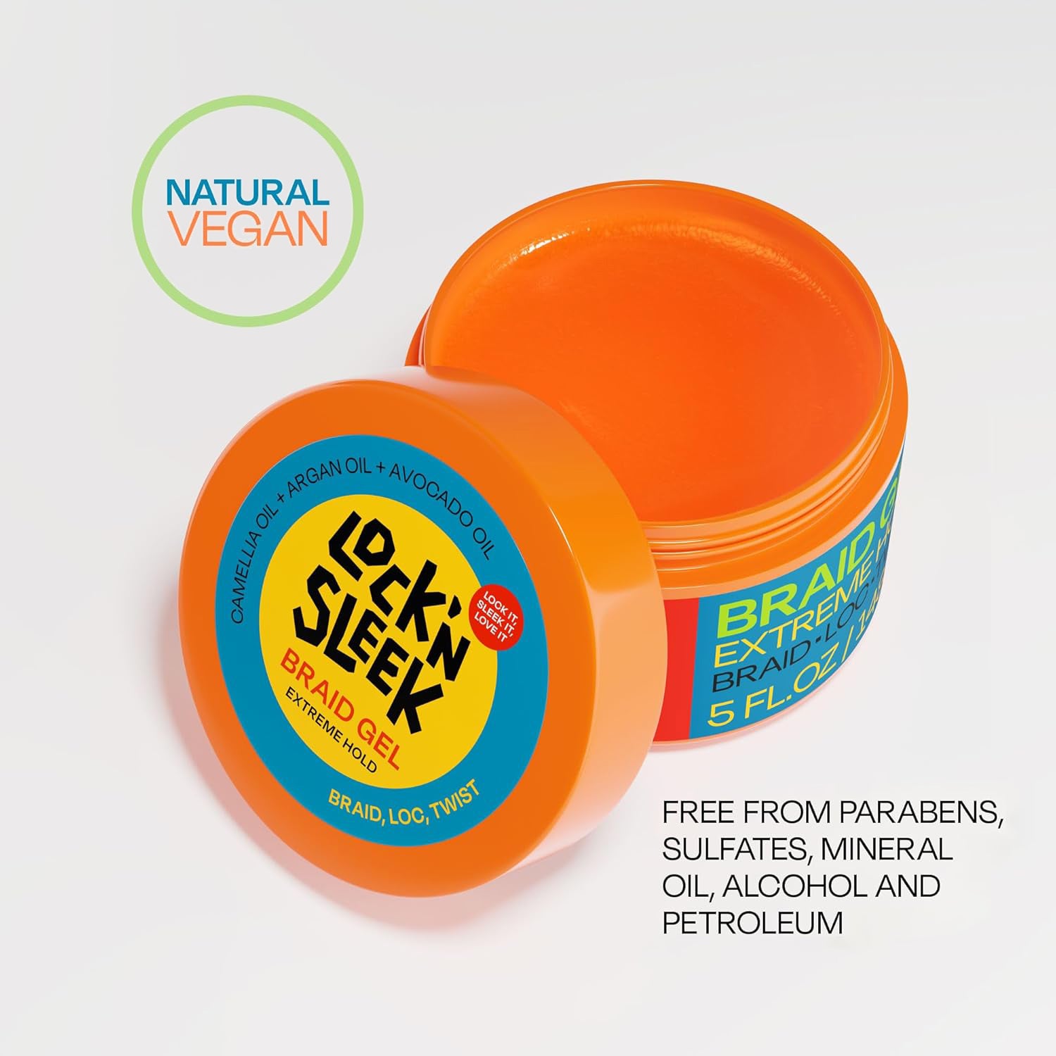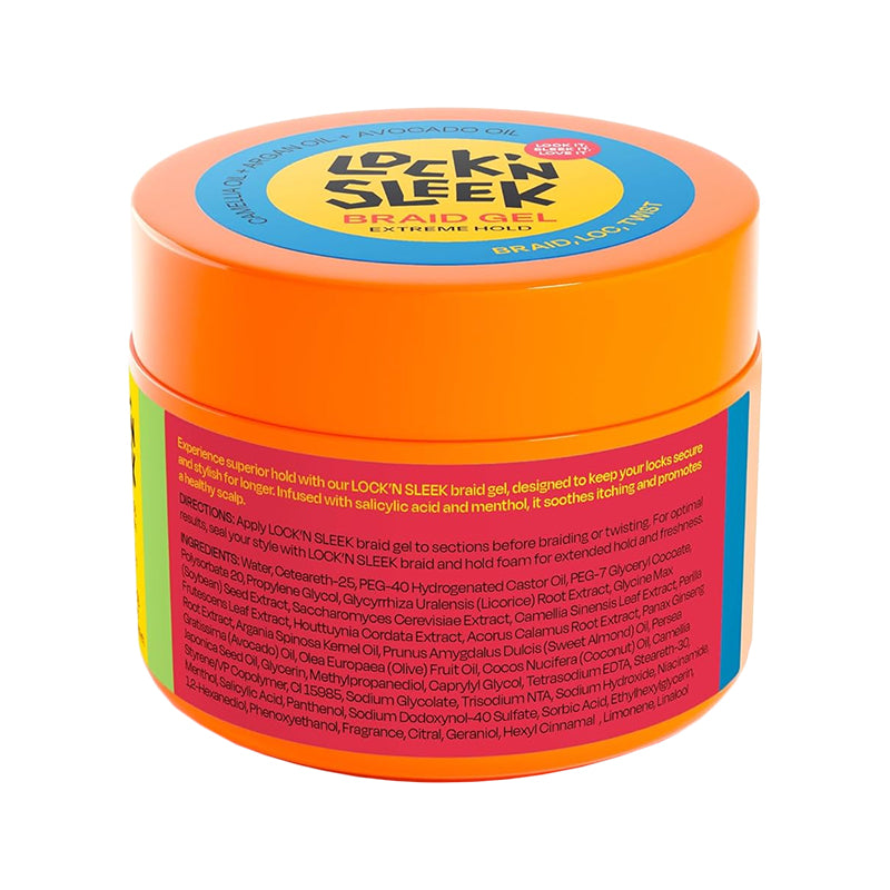 LOCK'N SLEEK 辫子啫喱,释放强力定型力量,打造完美辫子、辫发和扭发造型。这款多功能啫喱能够持久定型,不易脱落,让您的造型一整天都保持完美,让您自信地打造各种造型。啫喱带来顺滑洁净的效果,无白色残留,蕴含滋养的摩洛哥坚果油和山茶油,为您的辫子增添亮丽光泽。告别毛躁和凌乱,这款啫喱能够抚平不羁的秀发,打造柔顺亮泽的造型,从始至终保持顺滑。蕴含椰子油和鳄梨油,深层滋养秀发,泛醇和薄荷醇则为头皮带来舒适感,舒缓瘙痒,促进头皮全天健康。这款 Braid Gel 采用天然配方,不含对羟基苯甲酸酯、硫酸盐、酒精、矿物油和石油,采用值得信赖的纯素成分,为您提供干净、健康的定型效果。